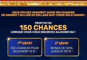 Sur Yukon Casino en ligne, le bonus de bienvenue est réparti sur vos deux premiers dépôts.